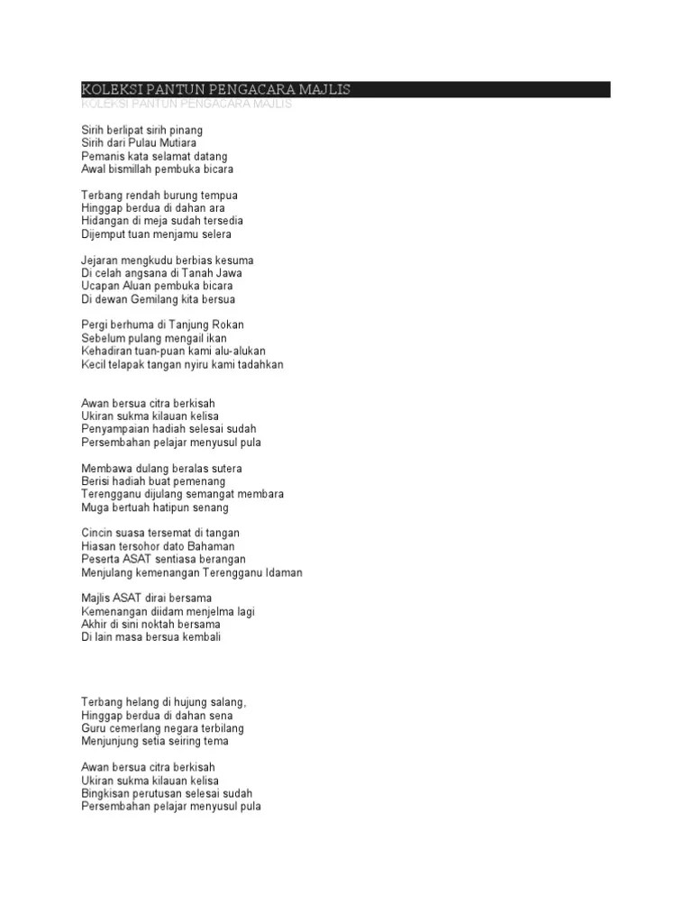 1) koleksi pantun pembuka acara / majlis. Pantun pembuka acara / majlis; Sekian sahaja ucapan saya, diharap dapat maanfaat semua. ٢٣ ربيع الآخر ١٤٣٩ هـ. Berikut ini kumpulan pantun penutup yang bisa digunakan dalam.